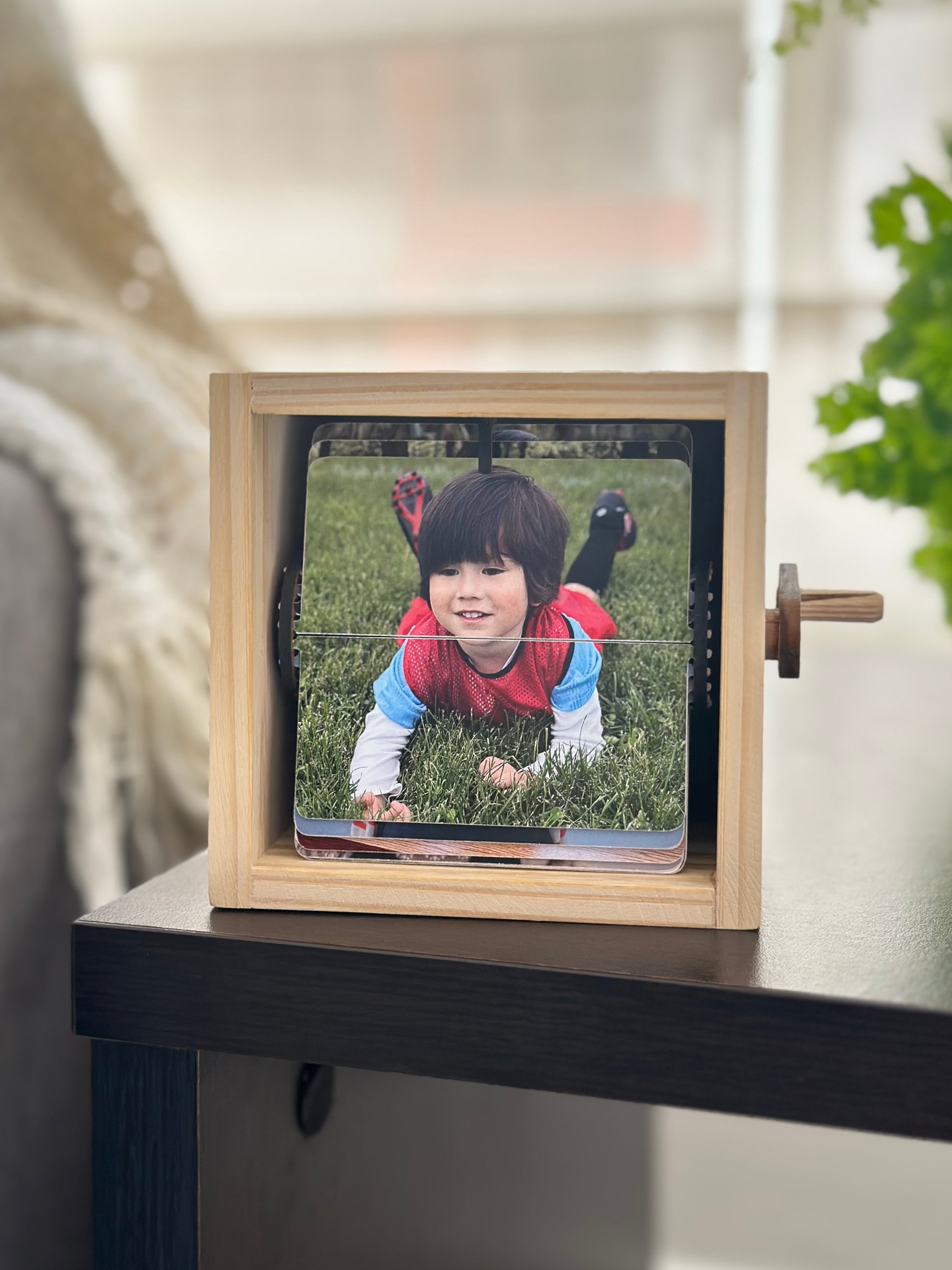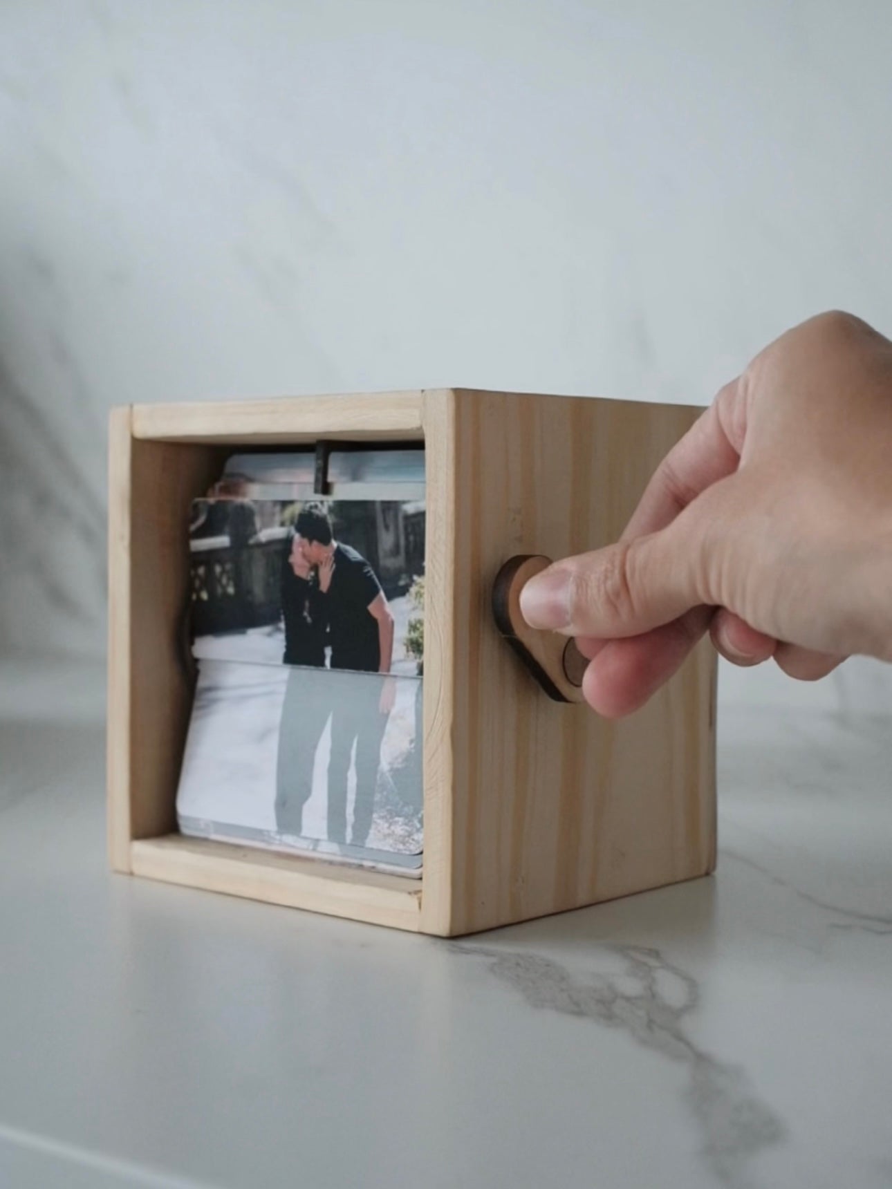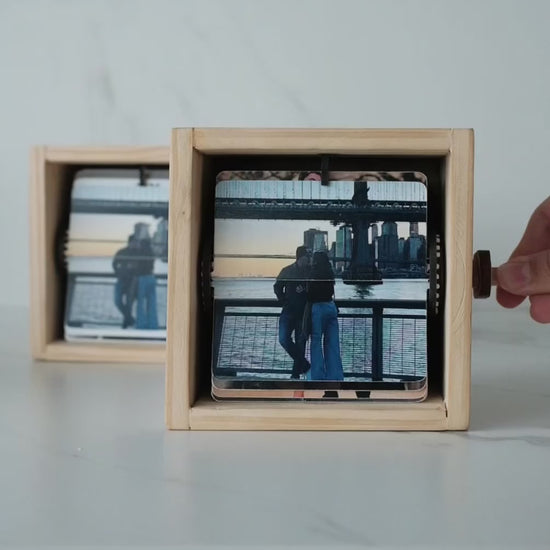 Nuestra FlipBox es una cajita de recuerdos hecha en madera de pino natural, pensada para revivir tus momentos más especiales de una forma mágica. Al girar la manija lateral, las fotos pasan una a una, creando un efecto tipo película que te permite volver a vivir cada instante con solo un giro.