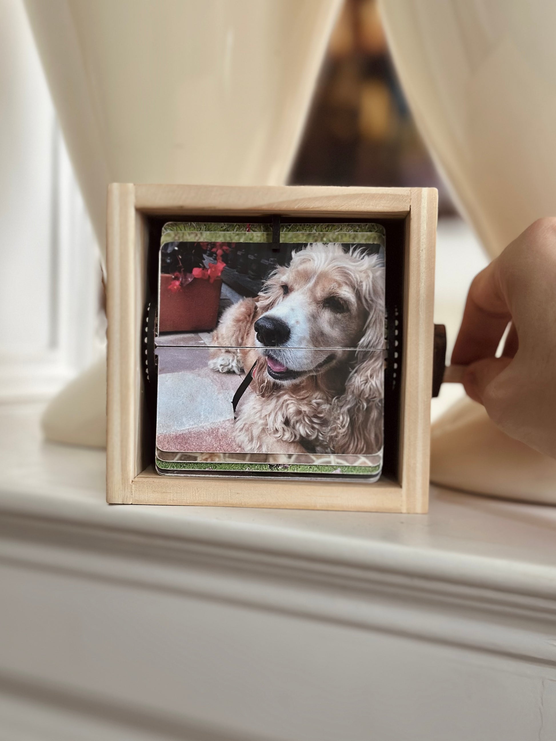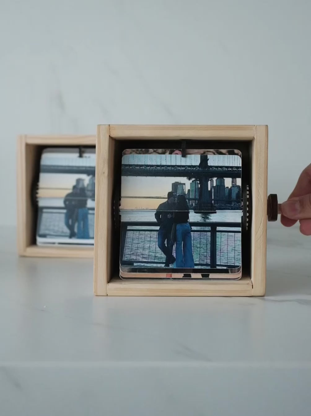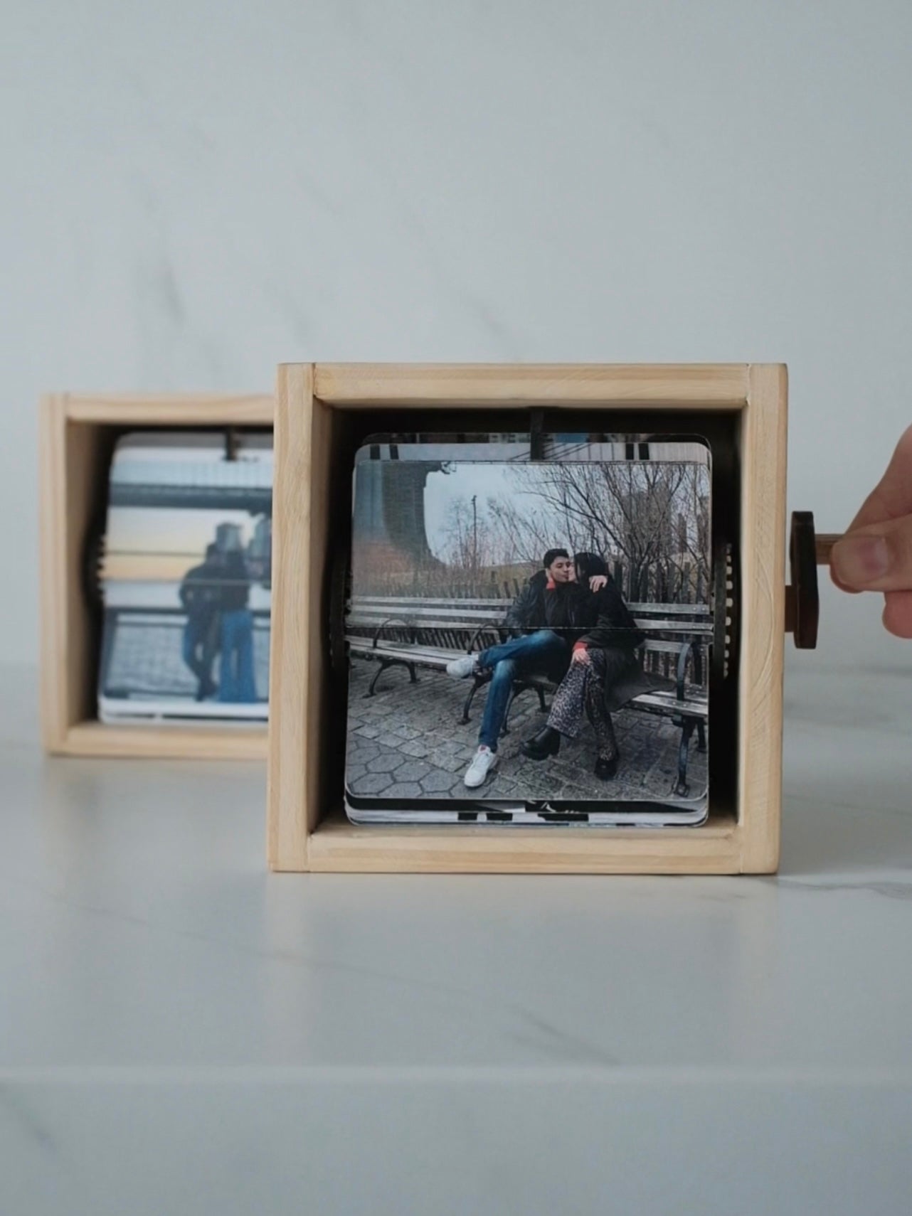 Nuestra FlipBox es una cajita de recuerdos hecha en madera de pino natural, pensada para revivir tus momentos más especiales de una forma mágica. Al girar la manija lateral, las fotos pasan una a una, creando un efecto tipo película que te permite volver a vivir cada instante con solo un giro.